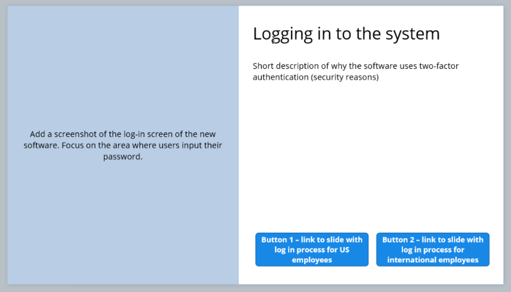 In Storyline 360 you just create really roughed out slides like the one I mocked up below to decide how you're breaking up your content, what the flow of your course is, and ideas for possible interactions and slide layouts.