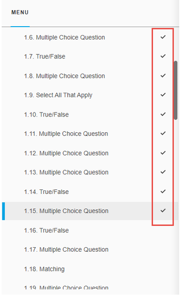 You can avoid the check marks by adding your questions to a question bank, and in the Player Properties > Menu, leaving Show Slide Draw Contents unchecked (click the gear icon next to the question bank). In this case, the questions will not be individually listed on the menu.