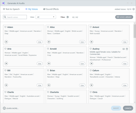 The 52 voices shown in the "My Voices" window represent all of the voices you can use when generating your audio files.