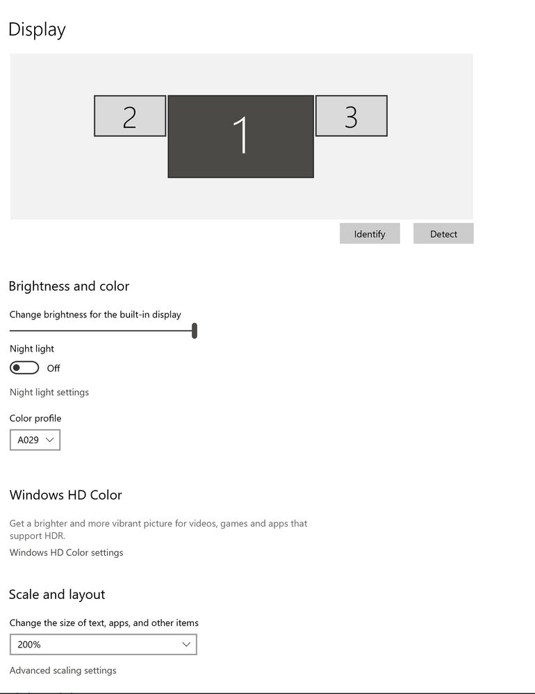 The main display "Scale and layout" is set to change the size of text, apps, and other items at 200% otherwise the entire user interface for Windows and all the apps is too small to use.