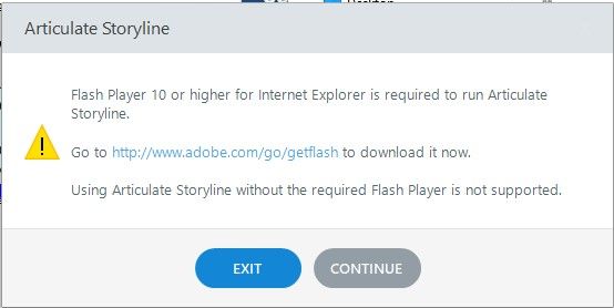 Selecting "Continue" allowed me to bypass this prompt but still, this indicates Storyline without Flash "is not supported."