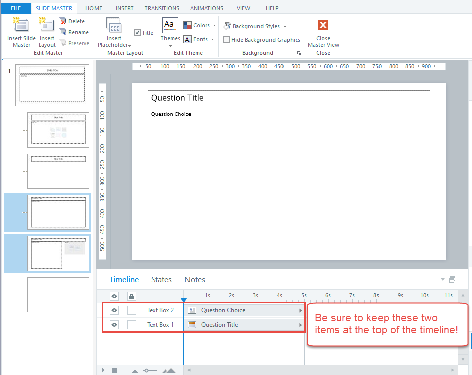 - It's vital that you keep the two default text boxes ("Question Choice" and "Question Title") at the top of the Question layout's timeline. Otherwise, your content will get screwed up.