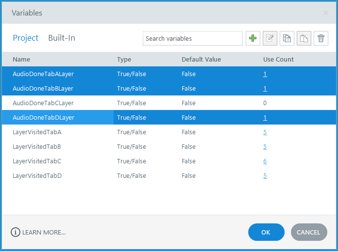 You've got 2 sets of variables. Most of the triggers use the "LayerVisitedTab_" variables. But a few set the "AudioDoneTab_Layer" variables to True.