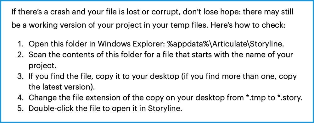 That is from this article about how to prevent corruption: Follow These Tips to Reduce Your Risk of Corrupting or Losing Project Files | Articulate - Community