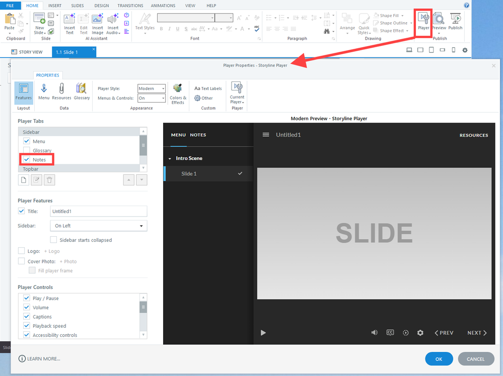 Deselect Notes in the Player Properties. That will remove them from the Player when you publish the course.