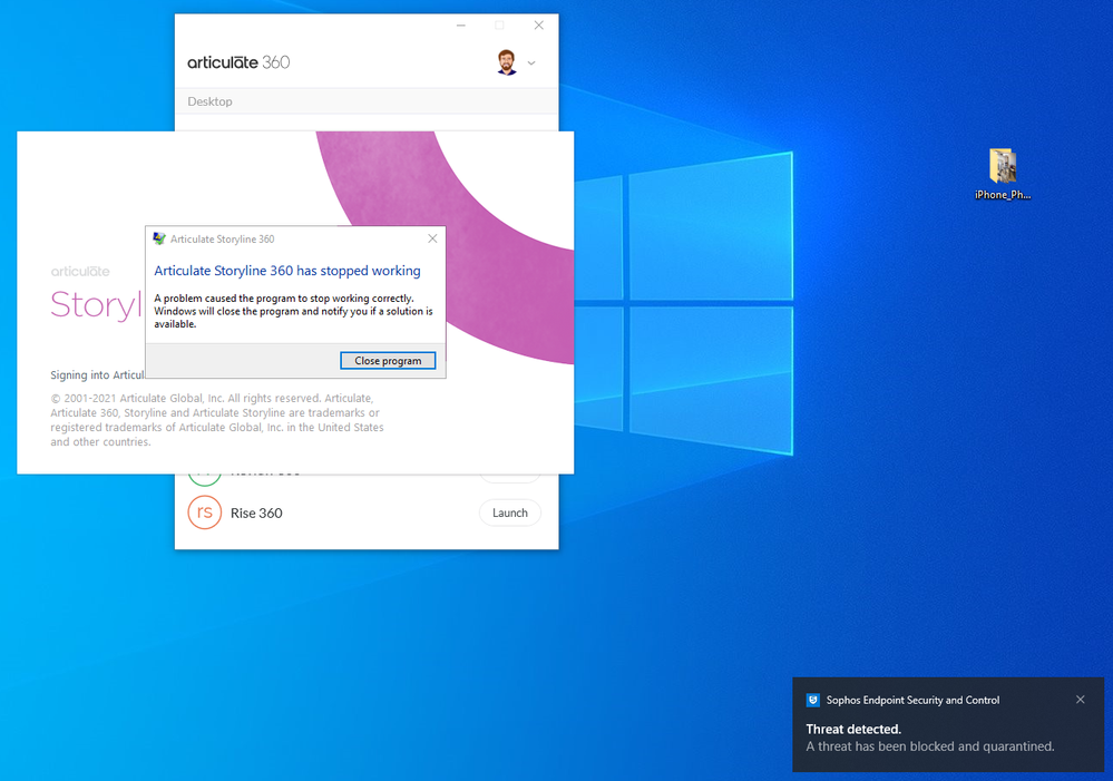 • I may be experiencing the same issue. I usually don't apply Storyline updates immediately but instead wait a week or so to see if there are issues. The last update was in June, though, so today I applied the update. As soon as I finished, my anti-virus software (Sophos) flagged a "threat detected" message when I launched Storyline, and then Storyline crashes.