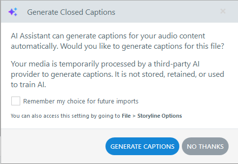 The issue appears to be related to dragging and dropping. Using the Insert function allows you to choose to "Generate Captions" or not.