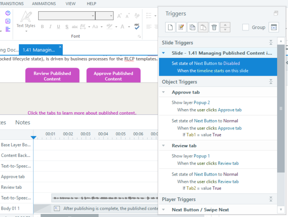 I created a page in Storyline 360 with three tabs, each having a corresponding layer that displays content when the tab is clicked. When the user enters the page, the Next button is initially disabled by changing its state.