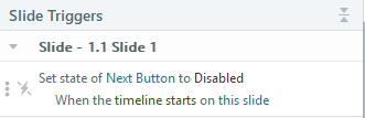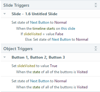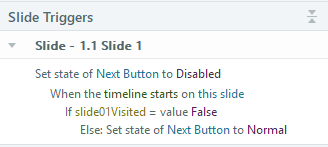 However, I would agree with PhilMayor's suggestion and rely on visited states instead. You could use a single T/F variable (e.g., slideVisited) that becomes True when all objects are visited, along with a trigger that changes the state of Next to Normal once all objects have been visited. Then, use a timeline start trigger to disable Next if slideVisited is False; otherwise, change the state of Next to Normal to ensure it remains enabled upon revisit.