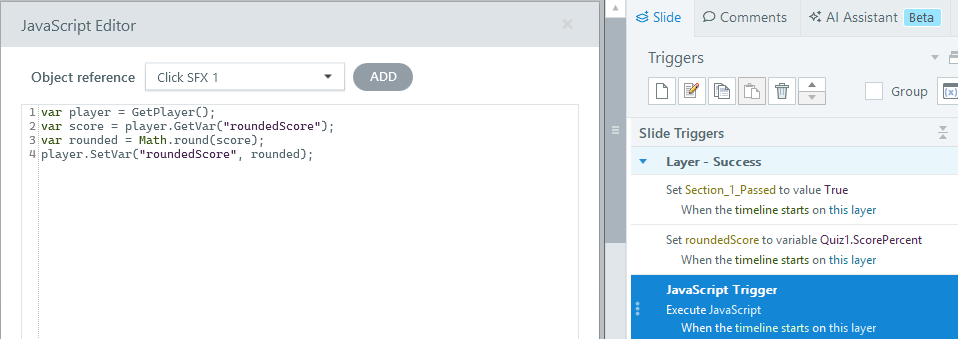 Leveraging the JS editor and a couple triggers to make reference variables like score results percents round to avoid decimals for a cleaner user experience on results screens.