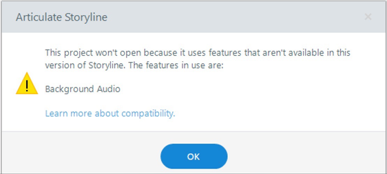Hello, I was wondering if there has been any fix or workaround for this issue? We are facing the same problem. We use some Articulate 360 licenses and a few Storyline 3 licenses. We have noted that when we open a module created with Storyline 3 in Storyline 360, do a minor edit, and save it, it will generate this error when we try to open it again with Storyline 3. We have not added any background music at any time.