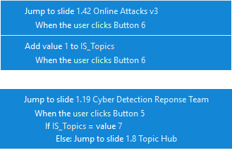 On the last screen of each topic, they are directed to the next section of the course if the variable IS_Topics has the required value, or else they are directed back to the Hub.