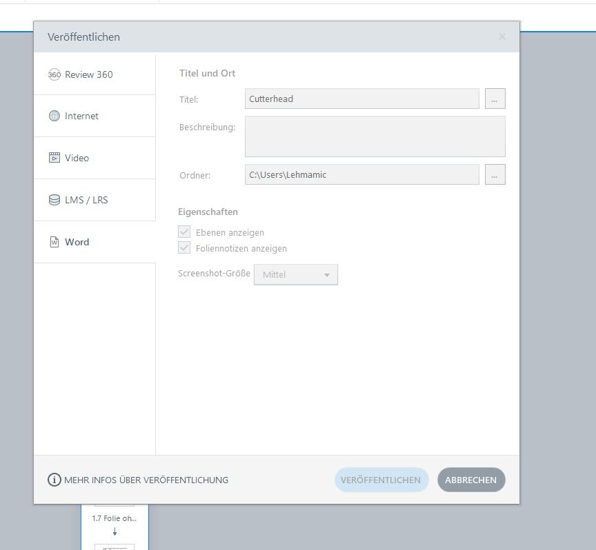 I'm using Storyline in Windows 8 and when publishing to Word (2010), the dialog box says that it's publishing slide x of y, but then it just hangs. Other factors: The .story file I'm working on is small - just 7 slides, Two of the slides have multiple layers, Word is closed when I publish.
