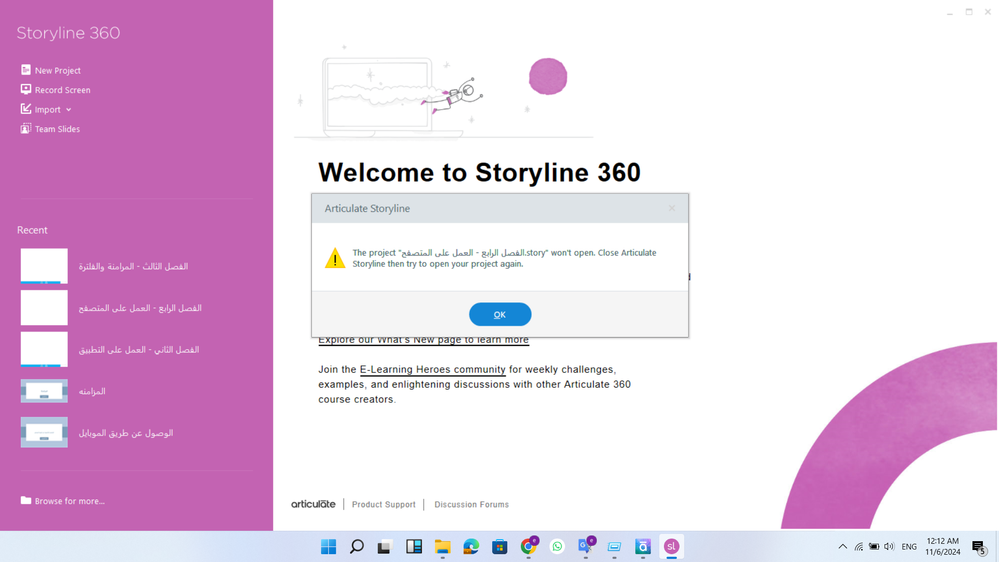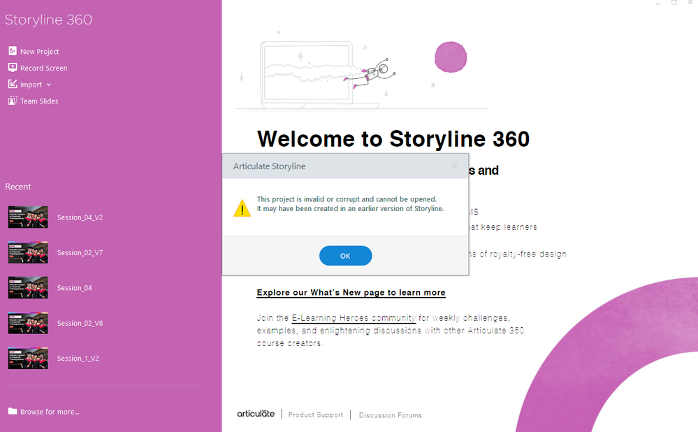 New issue today/yesterday with our team. With Storyline 360 files that have been working great for days or weeks, someone is working away in the file and/or tries to open the file and it all goes bad and we get the following error message: "This project is invalid or corrupt and cannot be opened. It may have been created in an earlier version of Storyline.".