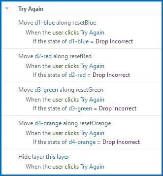 Agregue disparadores al botón "Continuar" en la capa "Intentar de nuevo". Cada activador debe mover el objeto en su ruta de movimiento con la condición de que el estado del objeto = Arrastrar incorrecto.Translated with Google Translate. I hope this makes sense. See the attached file.