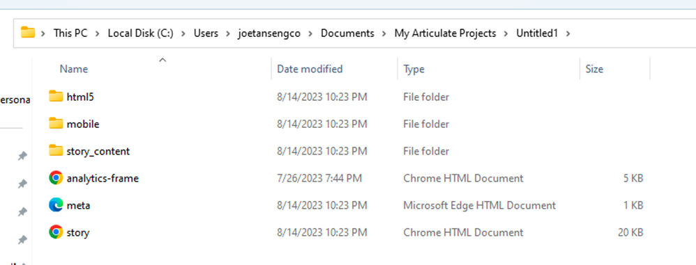 I have a project file on my computer titled "Project 1" (not the real project name, just for example purposes). When I published the Storyline file for the LMS, I did not get a warning that there was already a folder with the same name on my computer that would have given me any indication there was a problem. However, when I went to the "Project 1" folder on my computer, most of my files are missing from that folder and have been replaced with the LMS output files, despite the fact that the files were categorized in folders with names different from the output files.