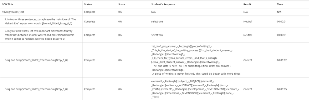 Do you all know if there's any way I can get SCORM 2004 to not report that ugliness while still capturing the "correct" result for the two drag and drop interactions? Even giving my objects nicer names doesn't really help in this case, so I'd like for it to be blank or for it to just report N/A or something similar.