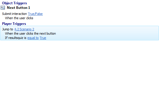 I don't see any other triggers or variables on the quiz question slides or results slide that are related to this trigger, so I'm not sure how to replicate that with my button but having it jump to slide 1 instead of the 1 quiz question. Is the only way around this to create additional feedback on the results layer that will show based on the variables I created.
