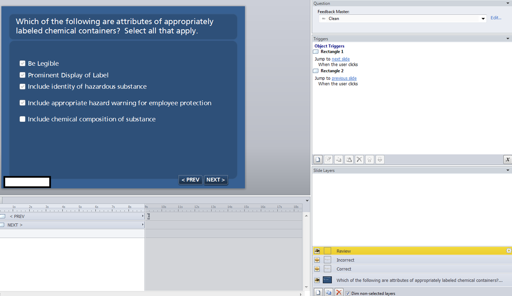 Just watched Jeannette's great screenr on creating customized Quiz Review slides. In addition to this customization, is there a way to move/edit the "Incorrect" and "Correct" text rectangle that appears at the bottom of each review slide? I don't think it was customizable in Studio Quizmaker, but maybe it is in Storyline? Thanks!