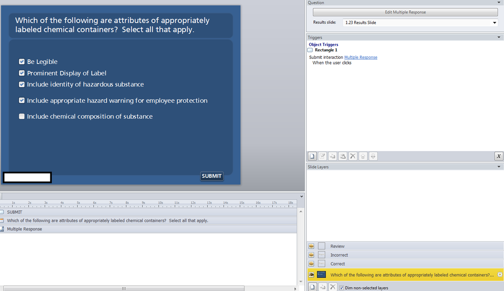 Hi Ashley,Thanks for responding. I guess I didn't do a good job of explaining. There is a trigger set to send it back to the beginning, but I'm having a problem with the default review features (green bar for correct/ red bar for incorrect along with checkmark) showing up when I set up an additional button (besides review quiz- which sends me back to the first quiz question) to allow the user to go back to the beginning of the course after taking the quiz. When the trigger I set for that button returns them to the beginning (post taking the quiz), it doesn't show the default features on the review slide (green/red bar), but it does show the additional features I placed on the review layer (custom navigation buttons).