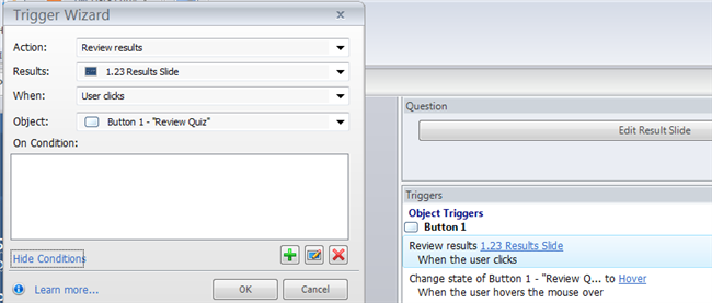 Thanks for your quick response Ashley. In regards to the review results trigger, it doesn't allow me to direct it to slide 1. I succeeded in creating a T/F variable on my Return to Content button and created a trigger on each slide to show the review when the variable equaled True. It shows the custom navigation buttons I placed on the review slide, but it does not show the correct/incorrect feedback found on the review layer when utilizing the Review Quiz button.Here is a picture of the trigger: