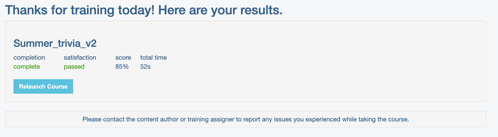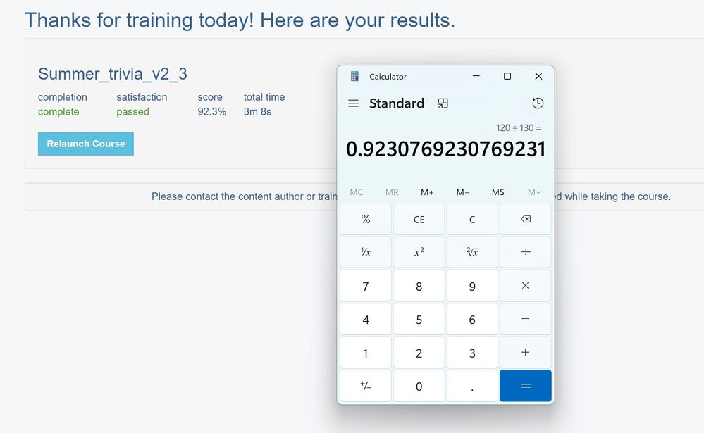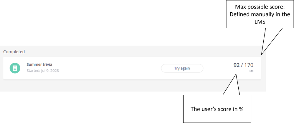 As for the 77%, correct me if I'm wrong but wouldn't this be correct since the learner scored a score of 100/130 which calculates to 76.9%? Seeing a score of 77 in your LMS would be the expected value in this case.