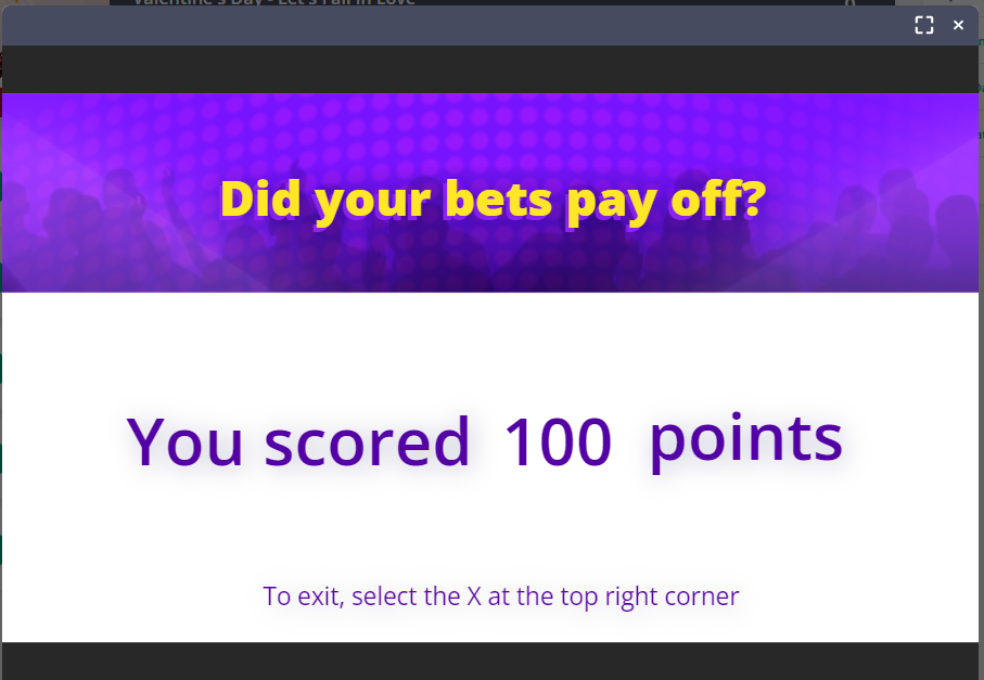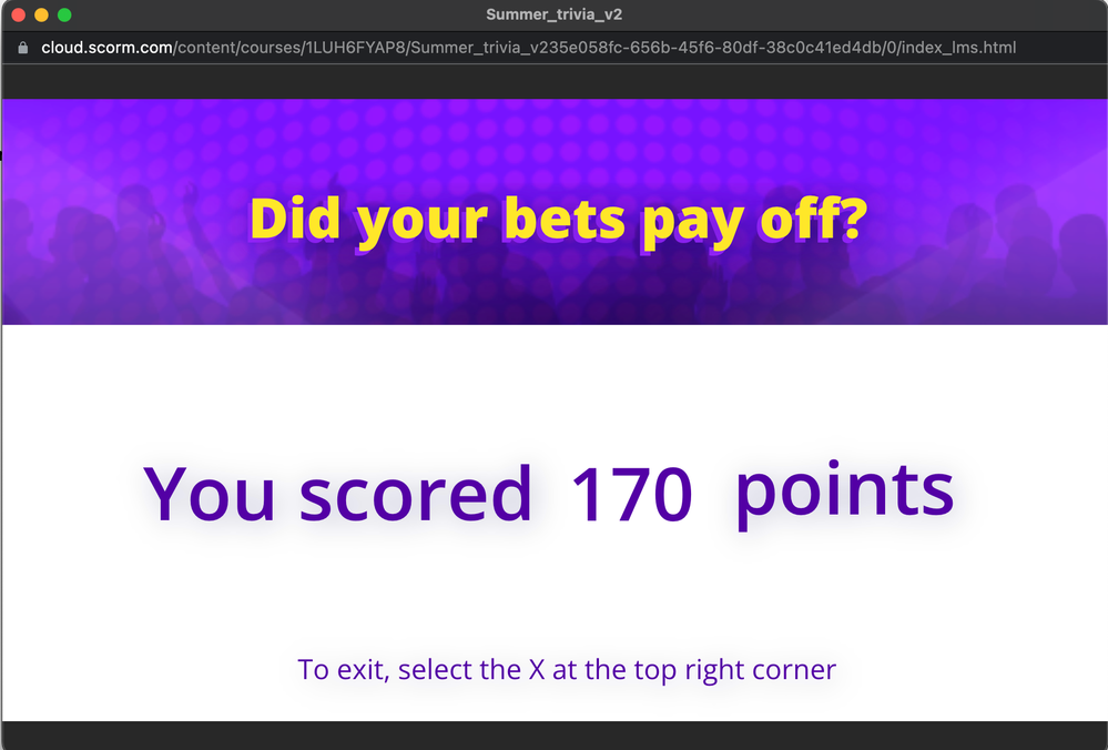 - I ran some tests on Joe's link above (with the "only score viewed questions" option enabled). I used up all the bets except the last one, worth 50 points. So the total score is 130. I deliberately chose the wrong answer on one of the slides worth 10 points, so my total score is 120. So 120/130 is 92.30%. Here's a screenshot of the results in SCORM Cloud. Following this pattern, do you also get 92.30% in your LMS? Also, can you share how you earned 100 points over seven questions? What slides did you answer, and what slides did you bet on? I'll replicate them on my end and see if I get the same results. Here's a screenshot of my test: