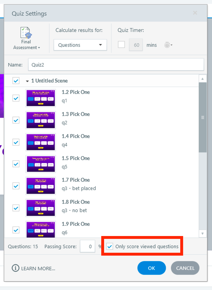 1. Since Storyline is reporting the score as percentage, all users that answered 10 questions correctly get 100%. However, this doesn't reflect the difference between user who didn't bet at all (max. score 100 points) and user who increased their score with bets (max. score 170 points). Is there a way to send the total score to the LMS?