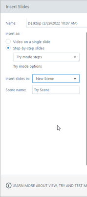 I am trying to record step by step screens in Storyline in Try mode. When I go to insert the slides it shows up as a video instead of each individual slide and recorded screen click.