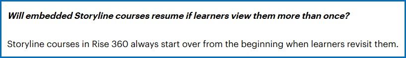 When a user exits and then resumes a Rise course, the Storyline blocks reset.