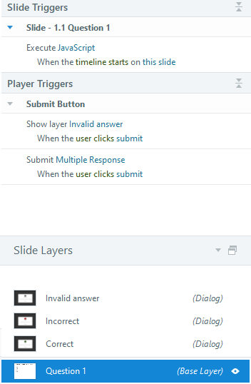 With that trigger, if any response is Selected, the program will perform the Submit [interaction], and it will show the appropriate feedback layer.