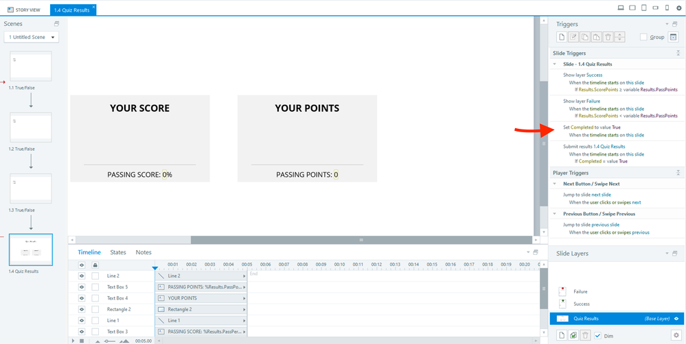 The red arrow points to a trigger that sets your Completed variable to true at the start of the timeline. The effect of this is that the 'Submit results' trigger directly proceeding it will always fire, no matter how well your learner scores on your quiz.