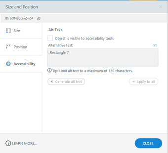 First, I want to point out how genuinely convenient it is that the Accessibility settings window (screenshot below) remains open (and refreshes) when selecting other objects in the editor. This allows us to QA/QC the accessibility settings for all objects in a page at an acceptable pace. The window also says open when navigating between slides and layers.