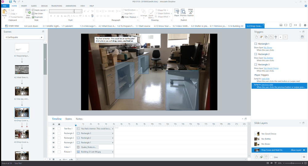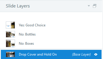 The idea is the learner clicks one of the highlighted regions, and in response, a trigger shows the feedback layer associated with that choice. If the learner clicks the correct place to drop, cover, and hold on, then the Yes: Good Choice layer displays: