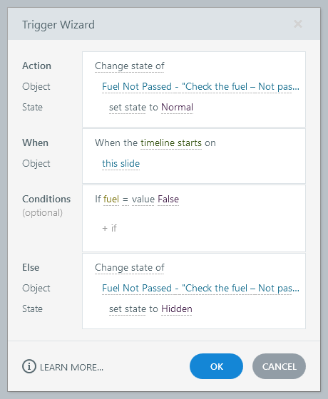 …and so on.The user then answers three questions on each of these key topics. If the user answers a question incorrectly in the "Check the fuel level" topic, we then set the variable "fuel" to false. Let's assume they answered everything else correctly, and they arrive at the results page.