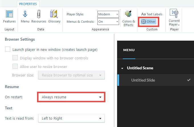 - Set the Player properties to "Always resume." (That'll prevent the users from re-launching from the beginning to retake the quiz.)
