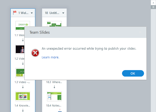 Team Slides - An unexpected error occurred while trying to publish your slides
