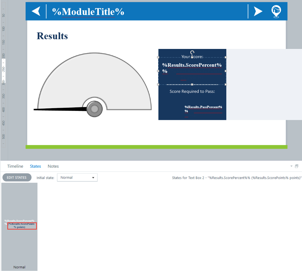 If you look at the State for the score's text box, you can see that the Results.ScorePoints variable is there. But its color matches the background, so it's not visible. (The red, squiggly spelling-error lines also indicate extra text beyond the Results.ScorePercent reference.)
