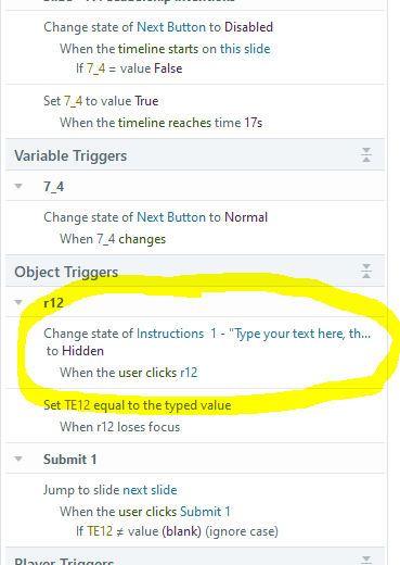 Hi Kate! Great question! To change the state of the instructions to Hidden on that layer, all you need to do is set the initial state of the instructions to Hidden. The object trigger you highlighted above isn't needed. Here's a screenshot for reference.
