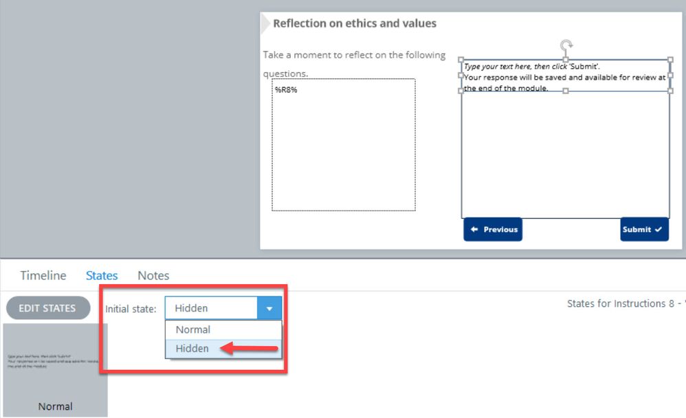 have just discovered that it isn't necessary to click the text box on the 2nd layer as the coursor is already there. how do i tell the instructions to change state to hidden?