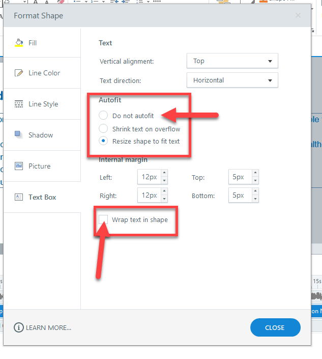 - Will_FindlayCommunity MemberNow the plot thickens because I've also discovered that when I close and then open the file, all the text box settings change themselves to "Do not Autofit" without "Wrap text in shape" selected.