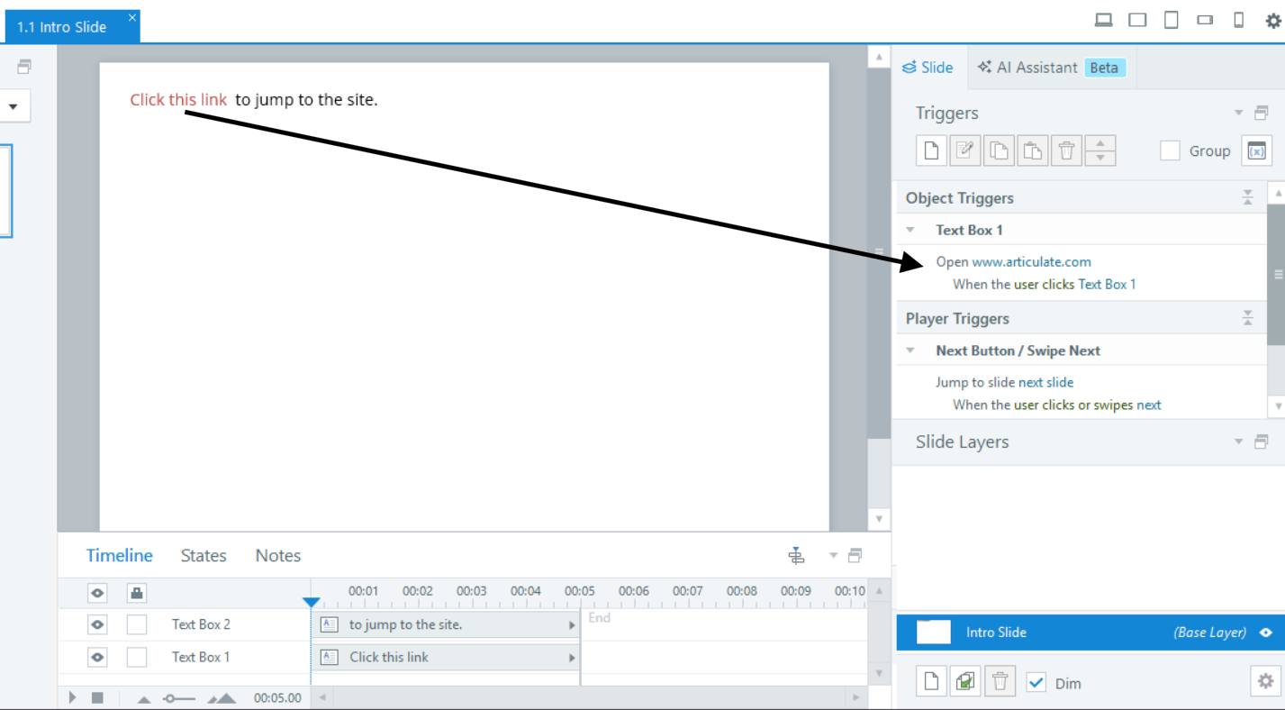 If you need different colors, one workaround is to format the text manually instead of using a hyperlink, then add a trigger such as Open URL/File when user clicks text. That way, you can control the color and still keep the link behavior.