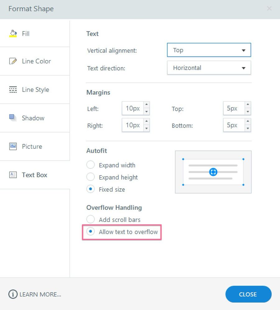 Your text box looks different than Eric's because it appears you're using the Autofit Fixed Size setting. Please open the Format Shape window. Select Text Box, then, Allow text to overflow.