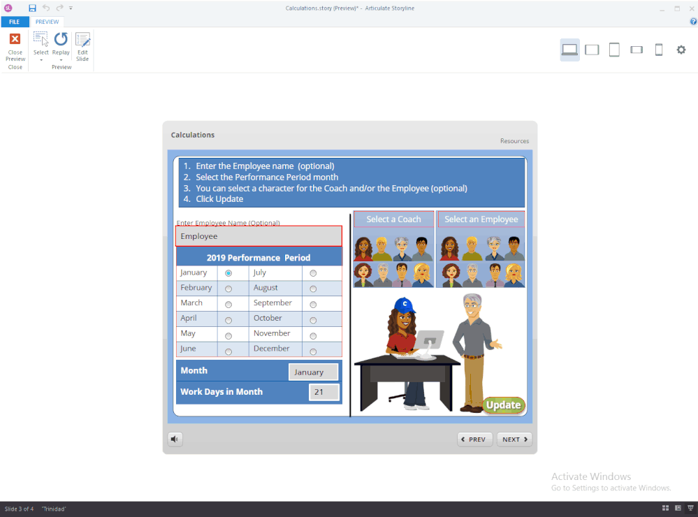 Here's my four slides. Click "Update" on the first slide. The second slide is the one with the issue. The last number entered will not update the variable, unless I "tab" or click somewhere outside the entry box. Here is an example of the numbers I entered: 6000, 8000, 5000, 4000, 1200, 600. Do not "tab" after the last number. Click "Update". Close the pop up box on the third slide. Notice that it does not report any numbers in the "Leave" row. It should read 600 minutes in the second column and 10 hours in the third column.