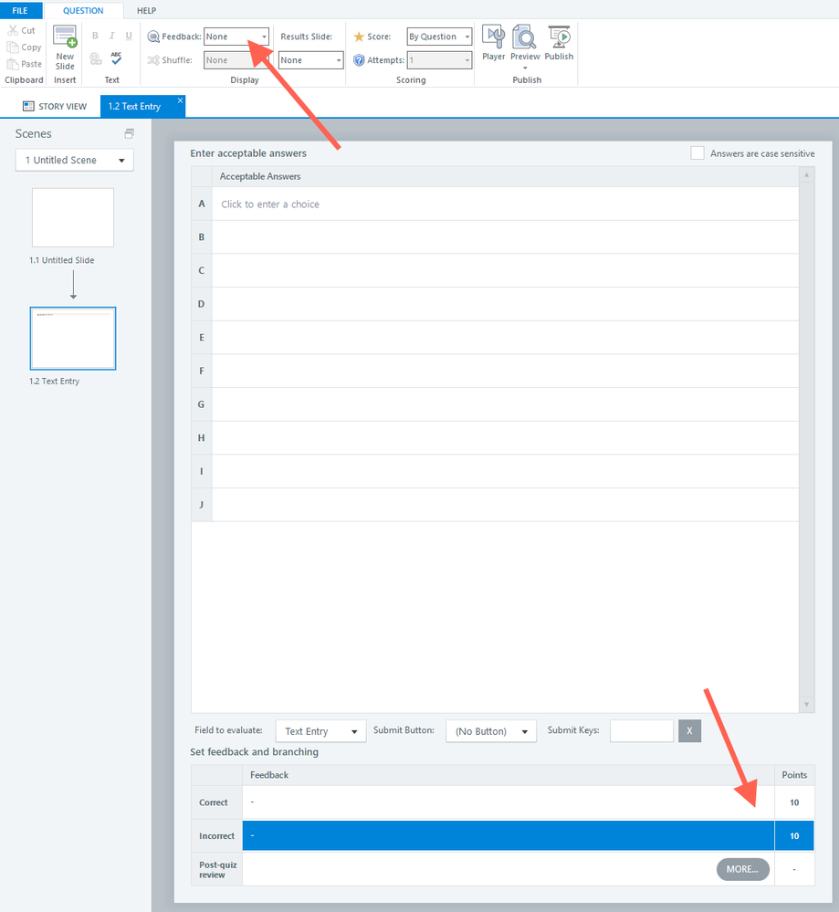 - A graded slide will require you to define acceptable answers, and it sounds like you want to award points for anything the learner types as an answer. You may be able to make it work by selecting Feedback: None and using the same point value for correct and incorrect answers.