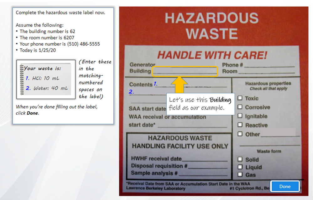 The page is an interactive hazardous waste form. The learner is asked to fill out the form correctly based on some information provided about the hazardous waste plus some other necessary info like "today's" date, the room number and phone number, etc.