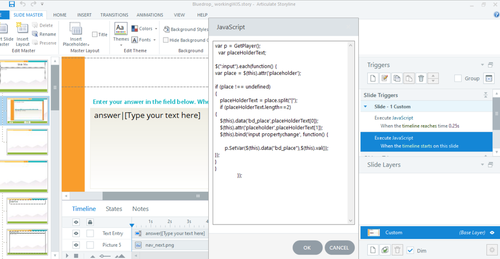 This also helps you to monitor what the user is typing letter by letter.This is the screen inside Storyline. It has the intro text. The text entry field. The placeholder text inside the field is important. Normally, it’s just what you want the user to see as a hint. This time, it contains two pieces of information, divided by “|”. The first part is the name of the Storyline variable (in this case, answer), the second is the actual text you want to display for the user.