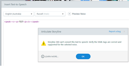 Text-to-Speak error when using SSML tags that I can't fix