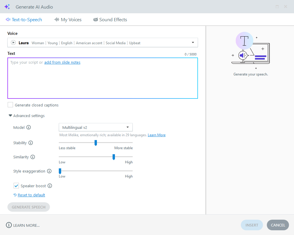 There's also a built-in text-to-speech feature included in Storyline 360, but this one has fewer features than its AI counterpart, though both are advanced enough to not sound robotic. Articulate AI's text-to-speech feature has enhanced capabilities and is also able to generate sound effects.