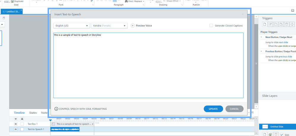 The steps Joe shared, will update the Text-to-Speech files already included in the project. When you said 'the text is gone' for certain slides, do you mean text that has only been added to a slide itself, then deleted? Storylines' Text-to-Speech dictates a script that's been added to the Text-to-Speech dialog window.